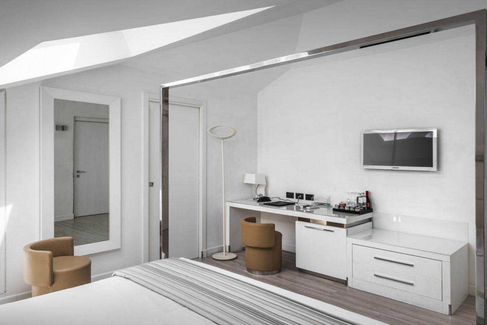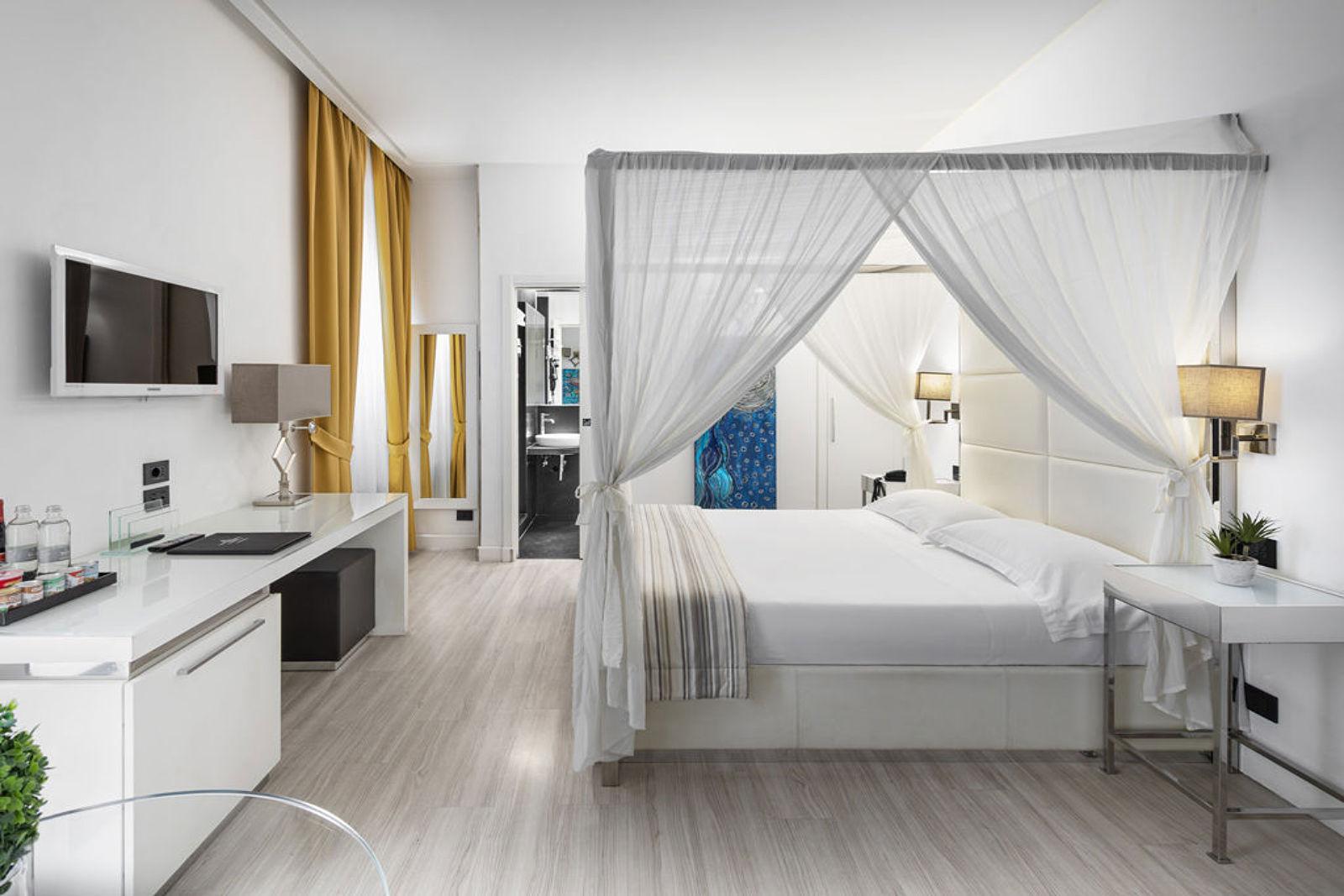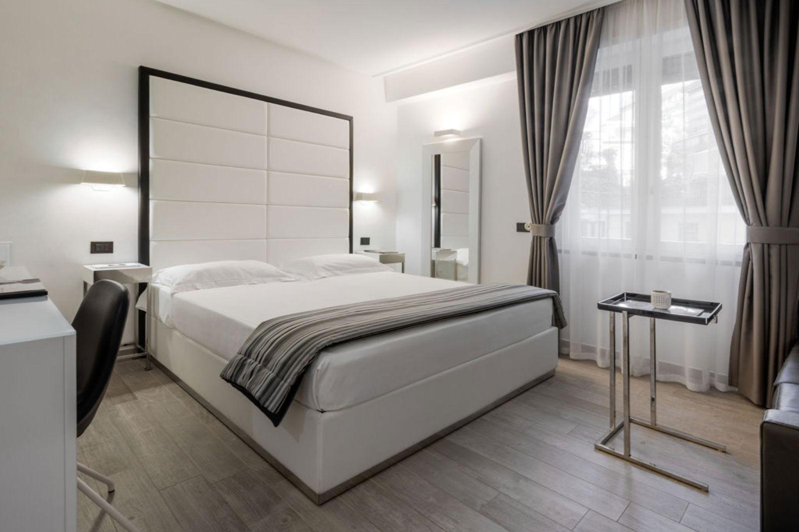 Schon beim Betreten des Hauses beeindruckt die Lobby mit architektonischer Eleganz: ein historische Palazzina aus dem 19. Jahrhundert, die behutsam restauriert wurde, behält viele charakteristische Züge, kombiniert mit markanten Schwarz‑Weiß‑Kontrasten und hochwertiger Ausstattung. Die Zimmer und Suiten sind stilvoll eingerichtet – mit edlen Materialien, modernem Design, vielen mit privatem Wellnesszugang –, Lichtspiele und Details sorgen für eine behagliche, zugleich luxuriöse Atmosphäre.