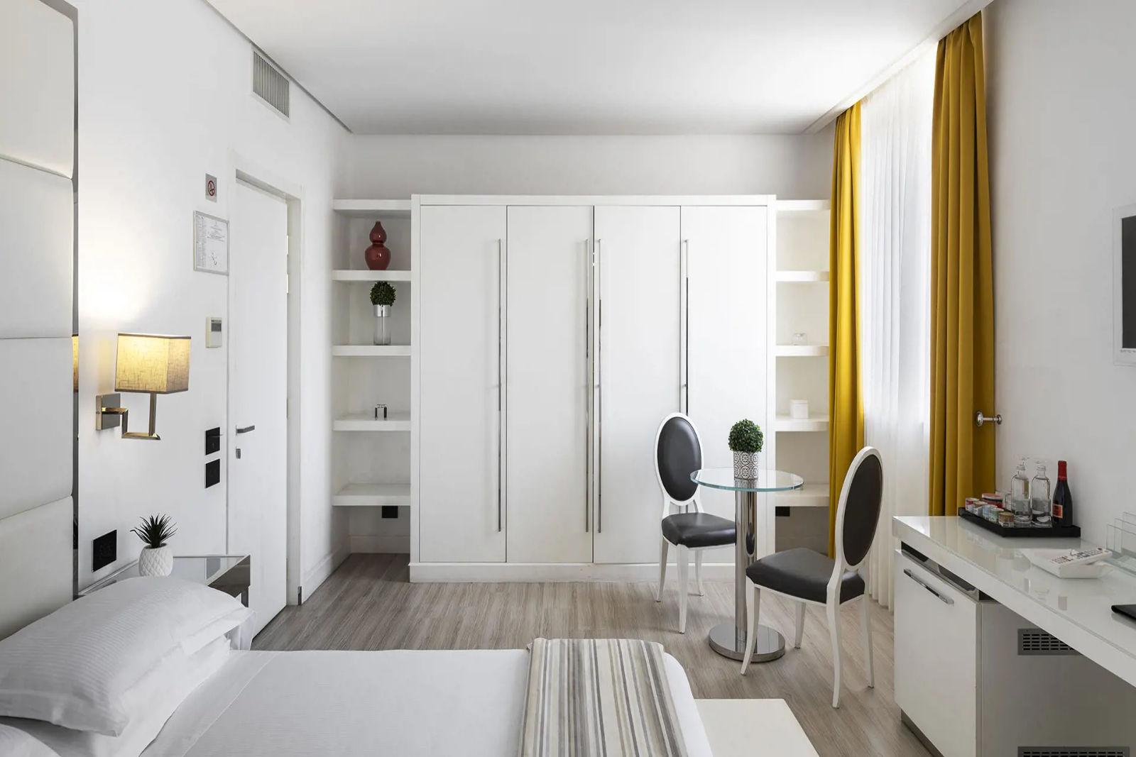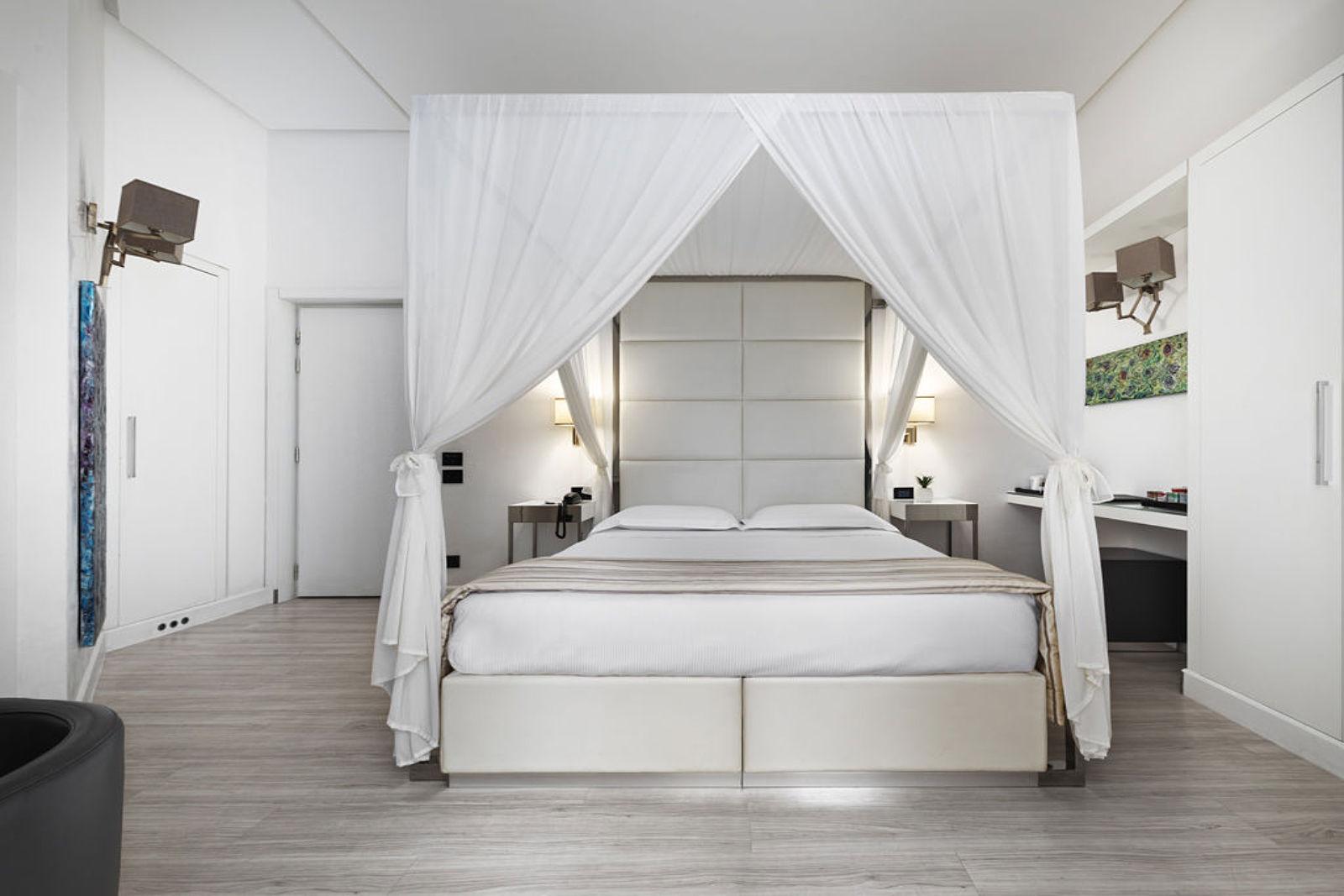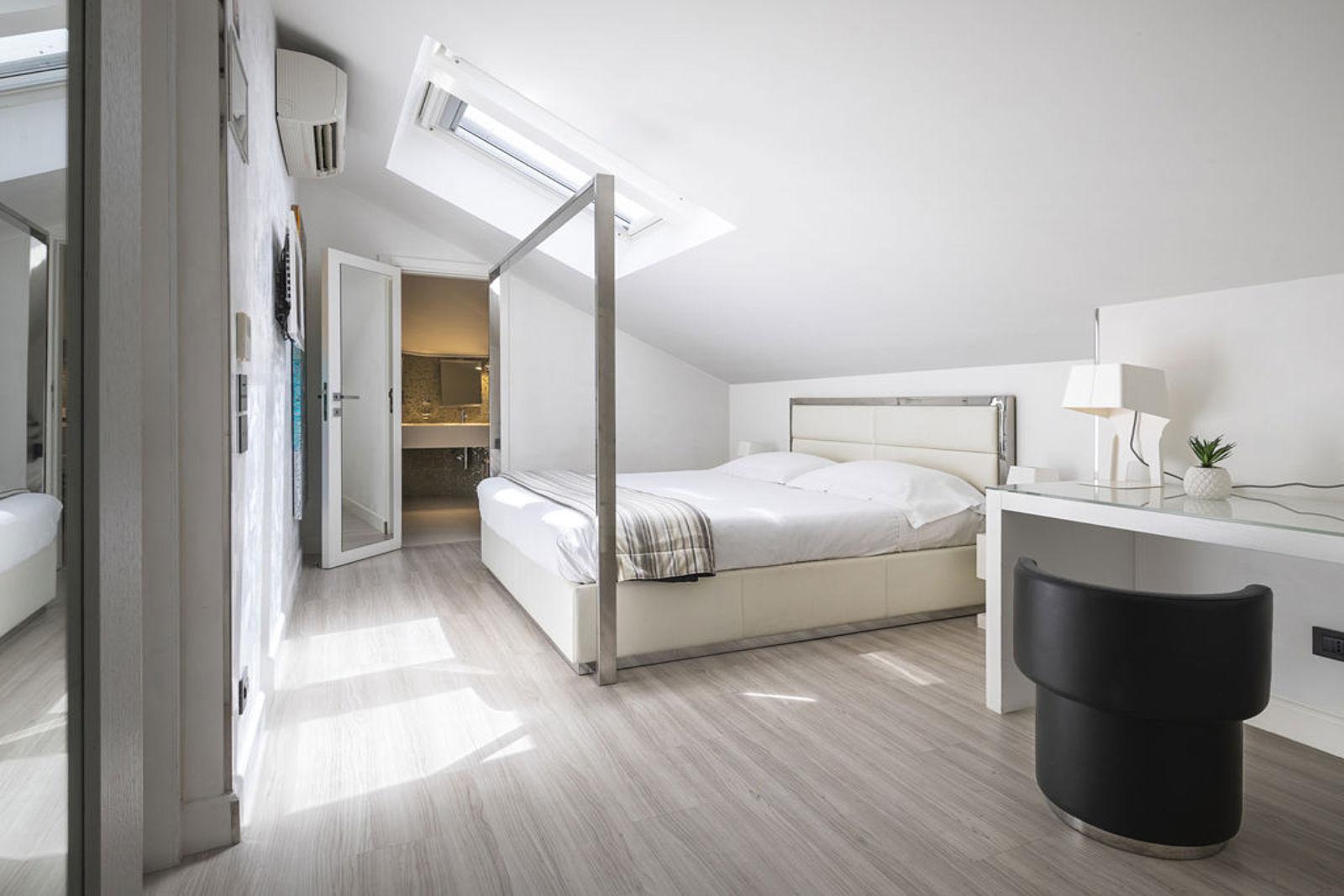 Schon beim Betreten des Hauses beeindruckt die Lobby mit architektonischer Eleganz: ein historische Palazzina aus dem 19. Jahrhundert, die behutsam restauriert wurde, behält viele charakteristische Züge, kombiniert mit markanten Schwarz‑Weiß‑Kontrasten und hochwertiger Ausstattung. Die Zimmer und Suiten sind stilvoll eingerichtet – mit edlen Materialien, modernem Design, vielen mit privatem Wellnesszugang –, Lichtspiele und Details sorgen für eine behagliche, zugleich luxuriöse Atmosphäre.