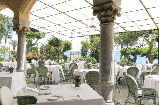 L'intérieur du restaurant est un hommage à l'élégance de la Belle Époque et les fenêtres du sol au plafond offrent une vue magnifique sur la mer Tyrrhénienne.